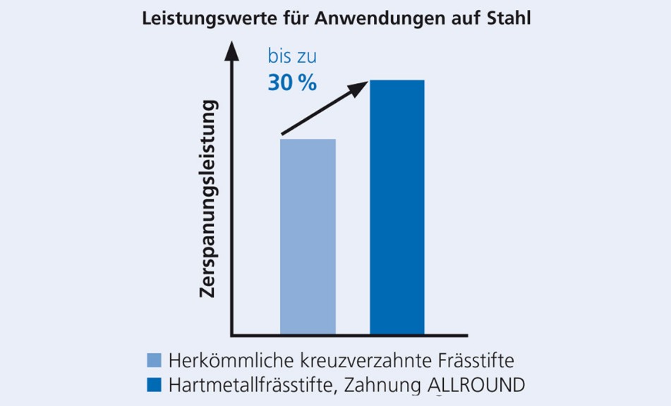 - Deutlich höhere Zerspanungsleistung als herkömmlich kreuzverzahnte Frässtifte.