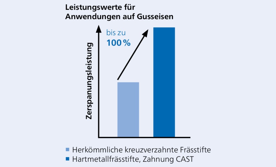 Die innovative Zahngeometrie ermöglicht im Vergleich zu herkömmlich kreuzverzahnten Frässtiften eine bis zu 100 % höhere Zerspanungsleistung im Einsatz auf Gusseisen.
