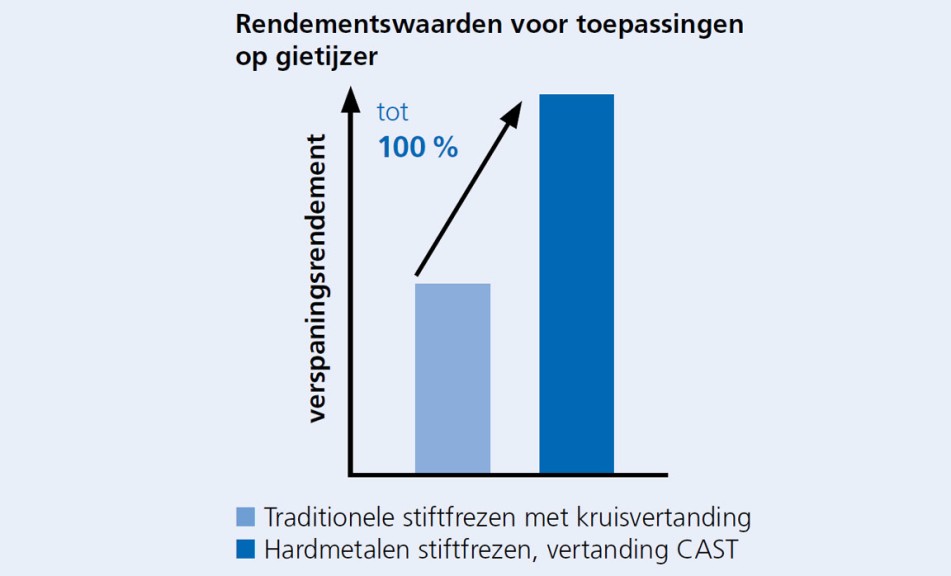 De innovatieve tandgeometrie maakt in vergelijking met de traditionele kruisvertande stiftfrezen een tot 100% hoger verspaningsrendement mogelijk bij het gebruik op gietijzer.
