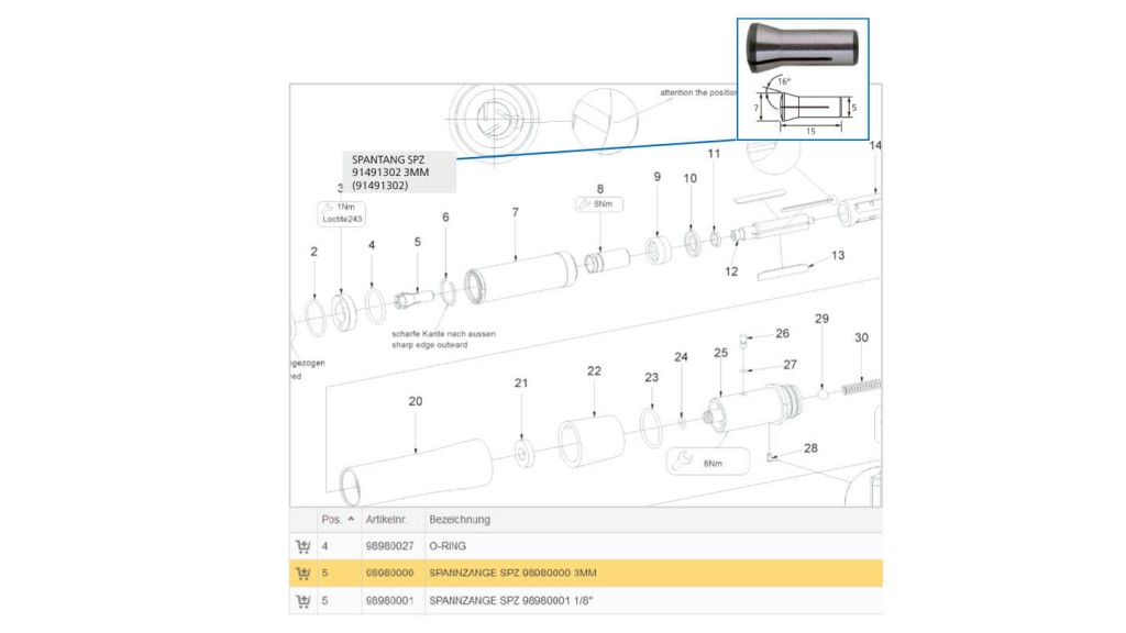 Machines kunnen in ons bedrijf worden onderhouden, maar deels ook door u zelf worden gerepareerd. Om hiervoor het juiste reserveonderdeel te vinden, hebben wij een afzonderlijke reserveonderdelen-catalogus voor u voorbereid. Hierin vindt u niet alleen explosietekeningen met alle reserveonderdelen, maar ook veiligheidsinstructies die u kunt downloaden.