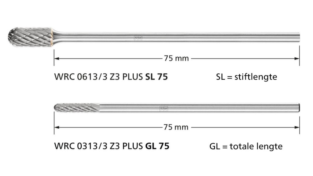 GL staat voor de totale lengte van een vol hardmetalen stiftfrees. SL heeft betrekking op de stiftlengte van een hardmetalen stiftfrees met stalen lange stift.