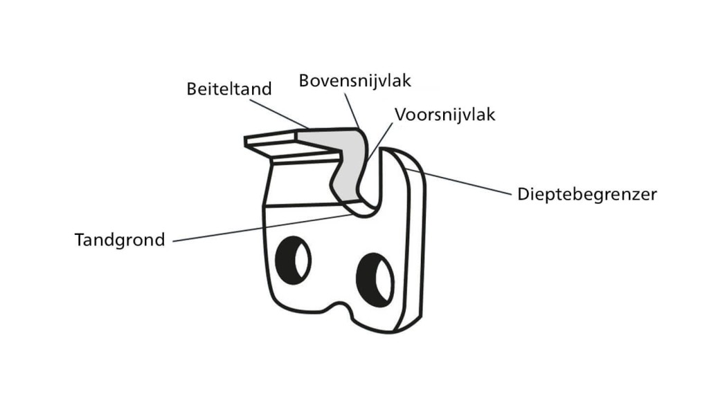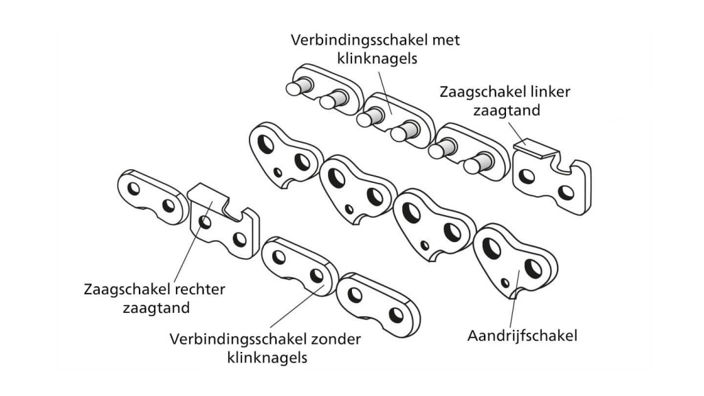 Een zaagketting bestaat uit zaagschakels, aandrijfschakels en verbindingsschakels.