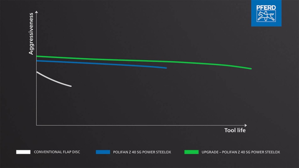 Wat betreft de standtijd van hoogrendementsgereedschappen staat de krachtige lamellenschijf POLIFAN Z 40 SG POWER STEELOX van PFERD TOOLS bovenaan !